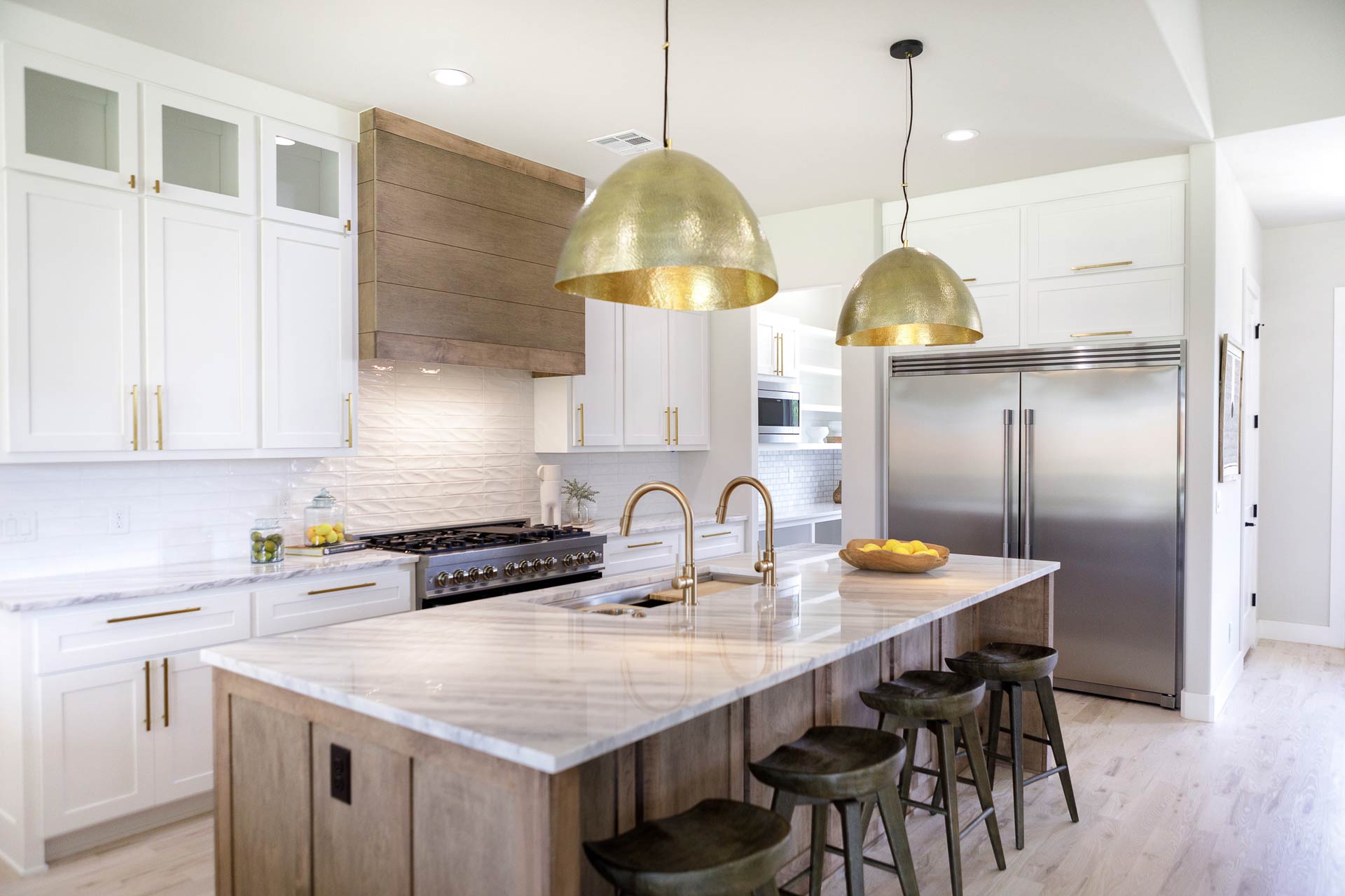 All the right textures, all the right finishes. Marble, brass, stone, and wood elements with luxury appliances make the space feel both high-end and functional. Not to mention there’s a double oven and built-in sub-zero refrigerator made for entertaining.