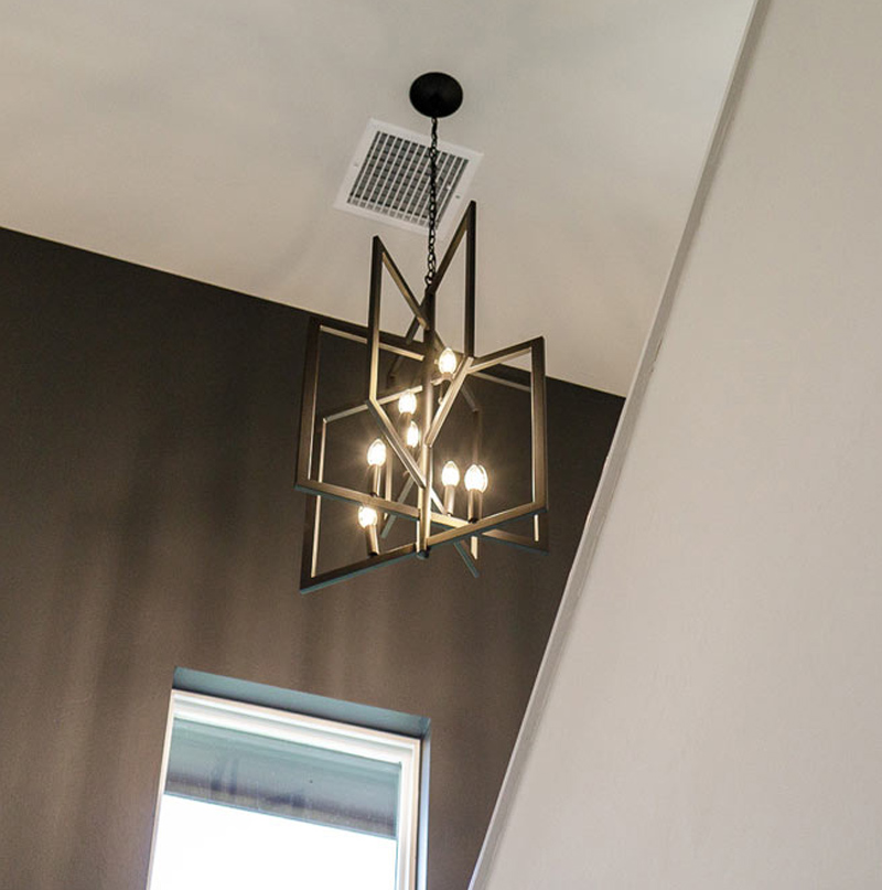 Fixtures should make a statement. You’ll certainly see that as you flow from the high-peaked, beamed living room with a 10-light chandelier to the designer, hammered brass pendants in the kitchen.